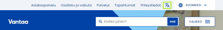 Översättningsknappen finns uppe till höger på webbplatsen och omedelbart till vänster om språkmenyn. Översättningsknappen finns på vantaa.fi och på alla relaterade temasidor.